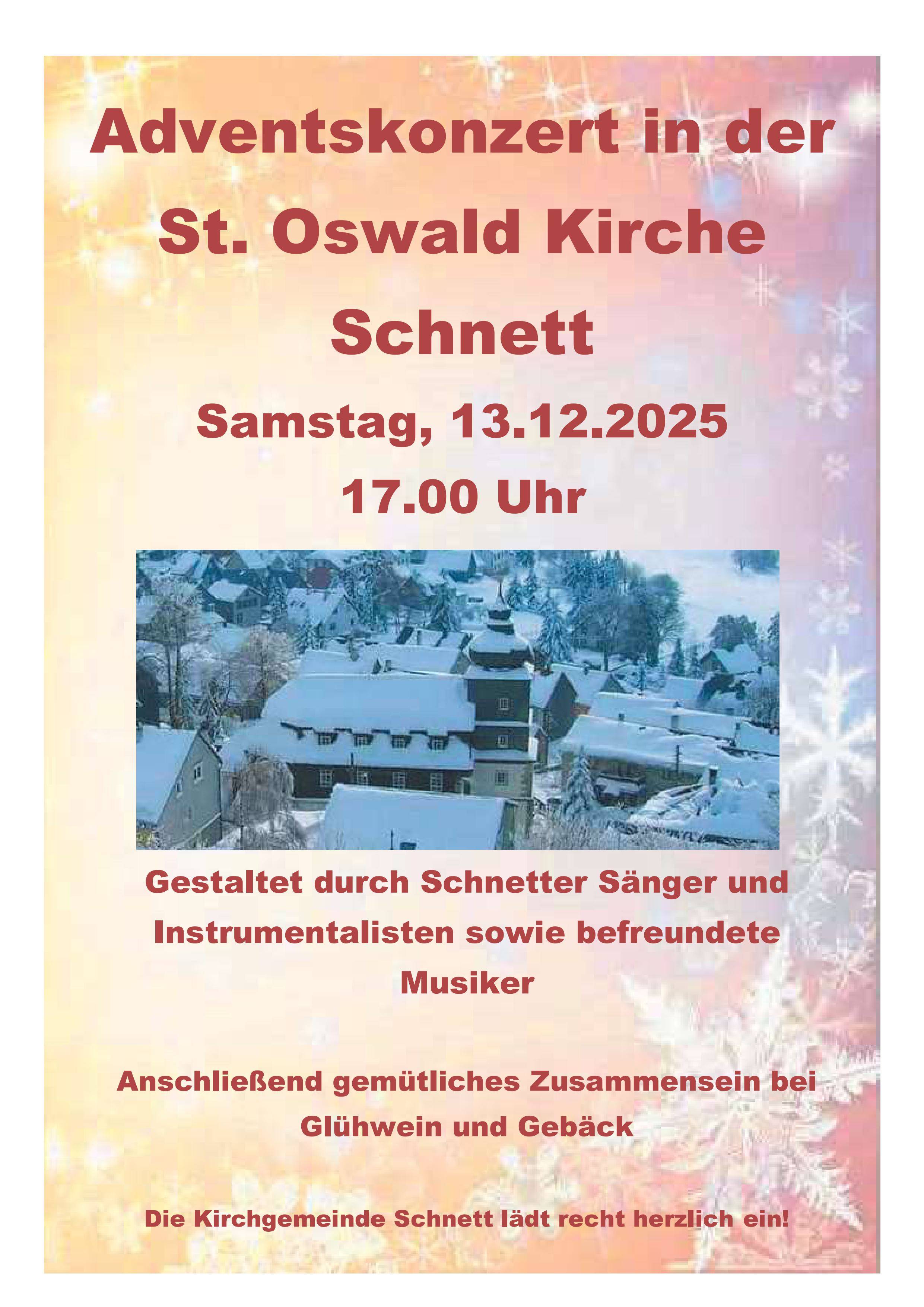 Gestaltet durch Schnetter Sänger und Instrumentalisten sowie befreundeten Musiker.Anschließend gemütliches Zusammensein bei Glühwein und Gebäck.Die Kirchgemeinde Schnett lädt recht herzlich ein.