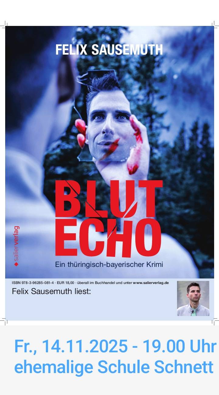 Felix Sausemuth liest aus seinem ersten Krimiroman "Blutecho" an einem seiner Handlungsorte in Schnett.