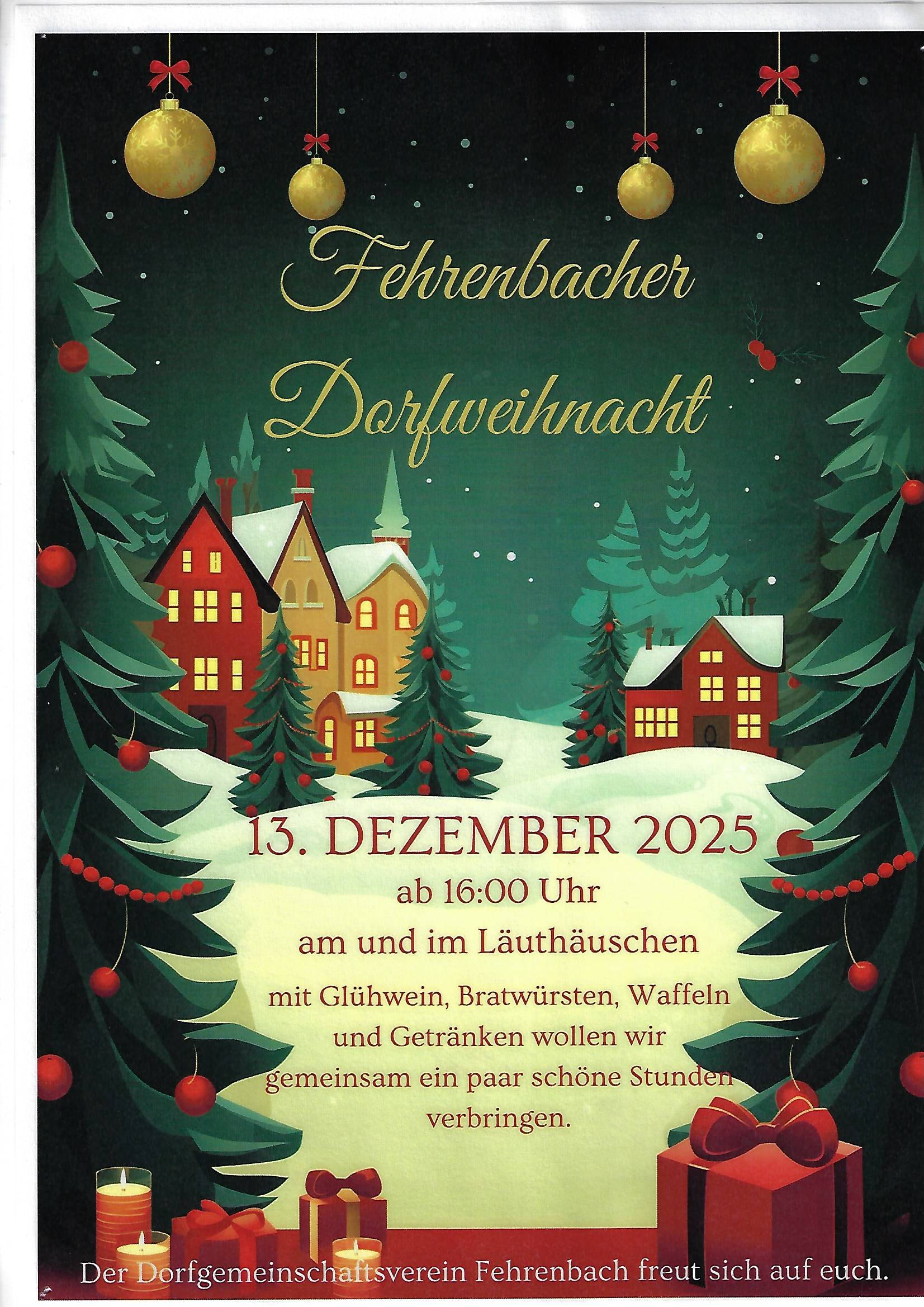 Beschreibung: Der Dorfgemeinschaftsverein lädt alle Einwohner und Gäste herzlich zur Fehrenbacher Dorfweihnacht ein.