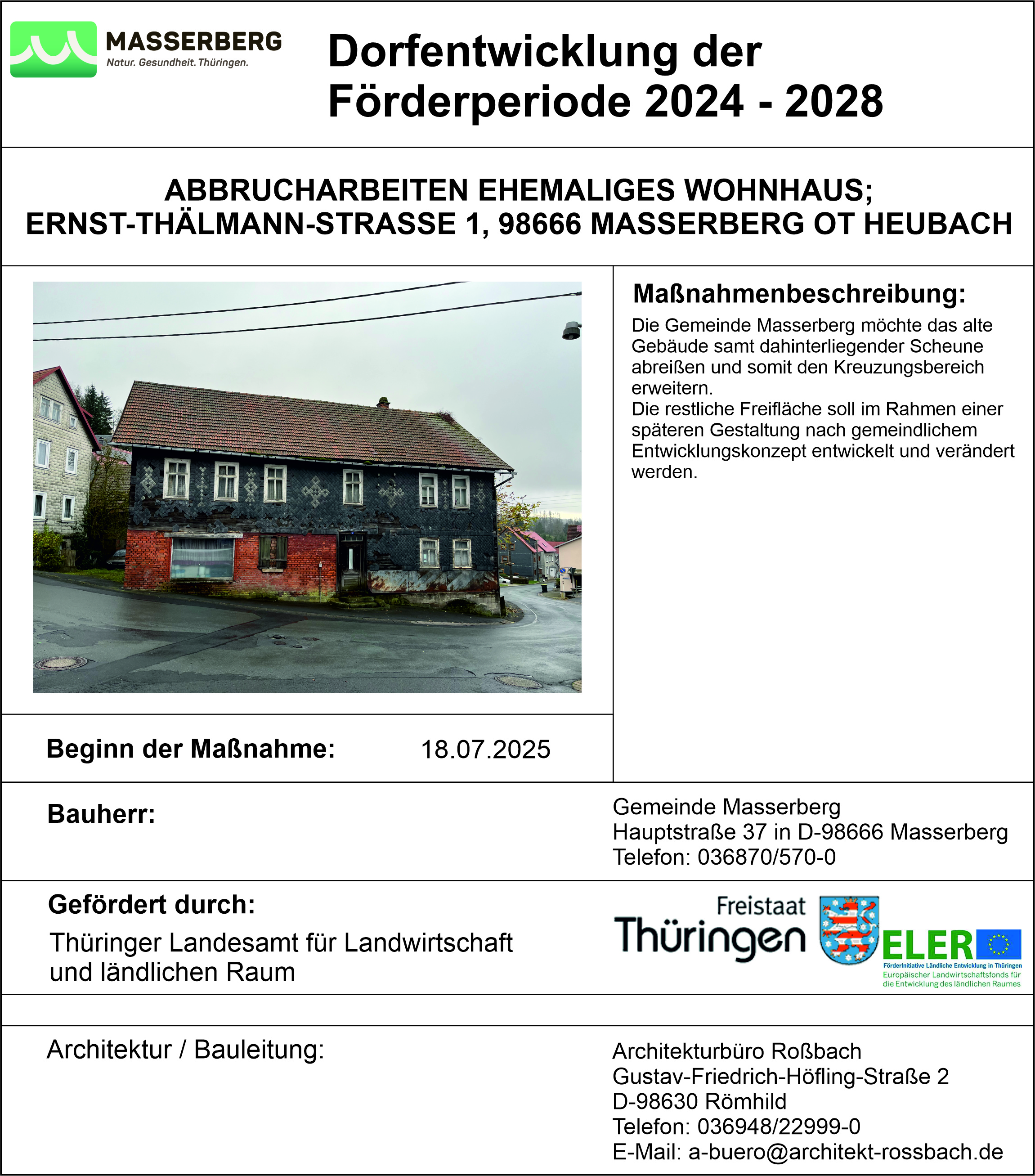 Das Wohnhaus in der Ernst-Thälmann Straße 1 steht im Ortsteil Heubach in einer Engstelle eines Kreuzungsbereiches von Ernst-Thälmann-Straße, Hessenecke und Rudolf-Breitscheid-Straße. Die Ernst-Thälmann-Straße und die Rudolf-Breitscheid-Straße sind die Hauptverkehrsstraße des Ortsteiles Heubach. An dieser Kreuzung kommt es oft zu Begegnungsverkehr der Linienbusse und größeren Lastkraftwagen und somit zu problematischen Verkehrssituationen. Diese Situationen wollen wir in Zukunft entschärfen. Die Gemeinde Masserberg beabsichtigt das alte Gebäude samt dahinterliegender Scheune abzureißen und somit den Kreuzungsbereich zu erweitern. Die restliche Freifläche soll im Rahmen einer späteren Gestaltung nach gemeindlichem Entwicklungskonzept entwickelt und verändert werden.